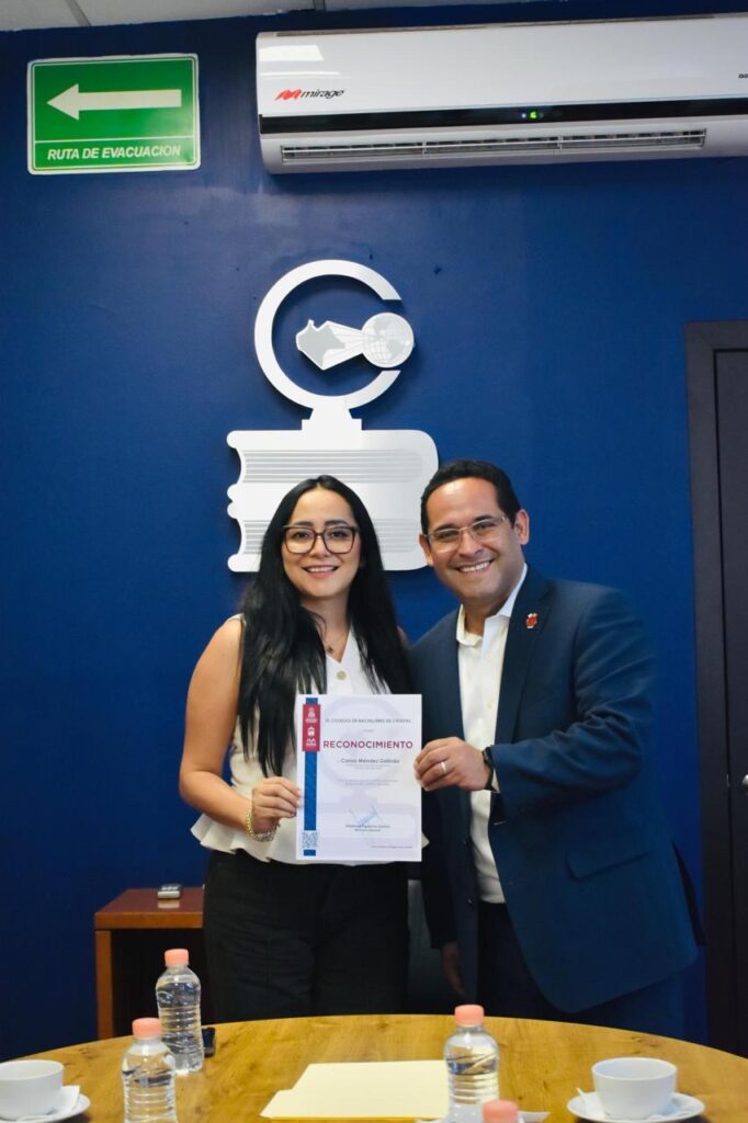 Al término de la ponencia, la titular del Cobach recibió en oficinas centrales al destacado profesionista en el ámbito internacional de estructuras sísmicas y presidente de la Asociación Mexicana de Exbecarios de Japón, Carlos Méndez Galindo, a quien entregó un reconocimiento y agradeció su compromiso por abrir estas oportunidades a estudiantes cobachenses.