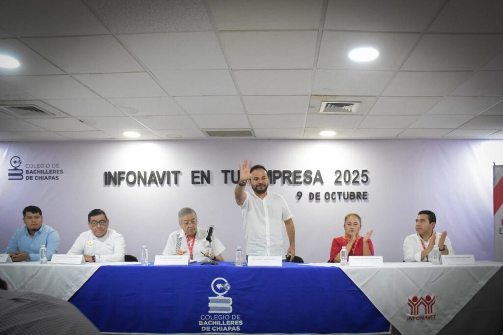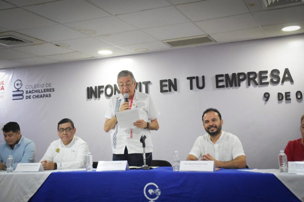 Tuxtla Gutiérrez, Chiapas 9 de octubre de 2025.- El director general del Colegio de Bachilleres de Chiapas (Cobach), Miguel Prado De los Santos, recibió el reconocimiento Empresas de Diez, otorgado por el Instituto del Fondo Nacional de la Vivienda para los Trabajadores (Infonavit), en reconocimiento al cumplimiento puntual de las obligaciones patronales en materia de créditos de vivienda.