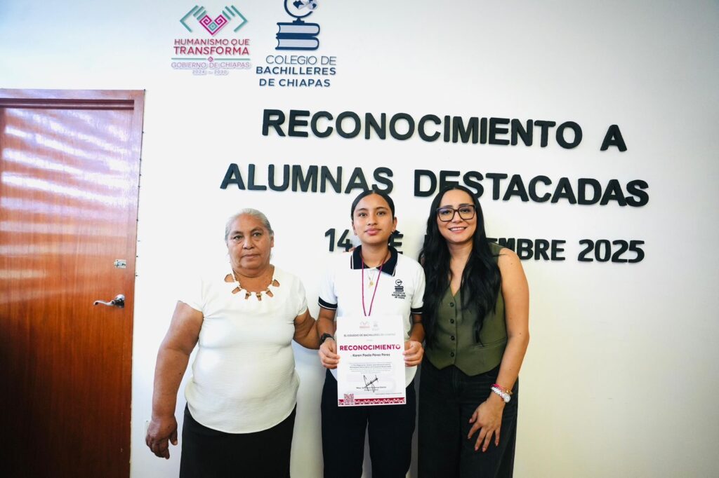 Tuxtla Gutiérrez, Chiapas; 14 de noviembre de 2025.- Con el propósito de enaltecer el talento y el esfuerzo de la juventud cobachense, la directora general del Colegio de Bachilleres de Chiapas (Cobach), Viridiana Figueroa García, hizo entrega de reconocimientos a dos alumnas destacadas en el ámbito deportivo y académico.